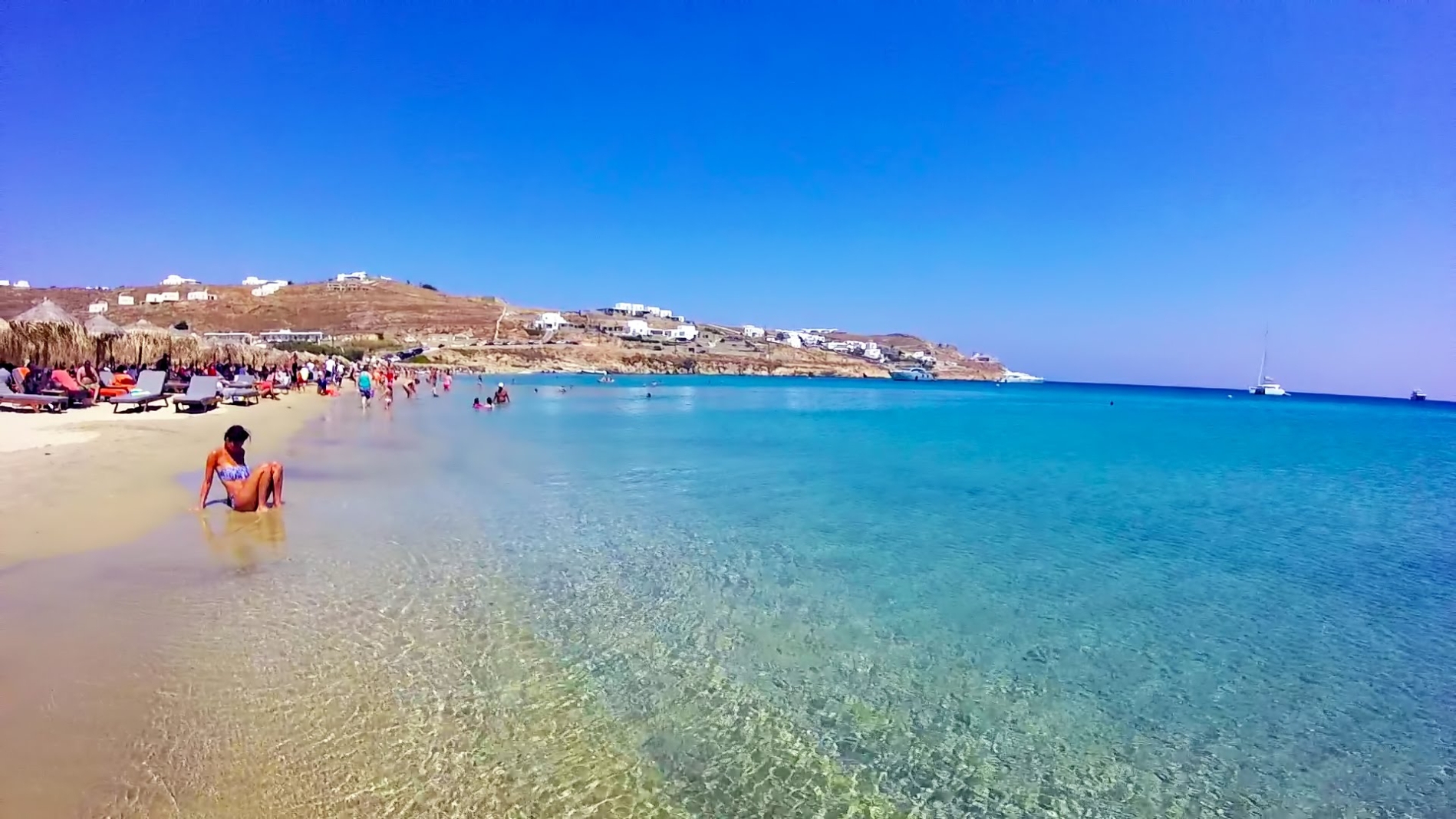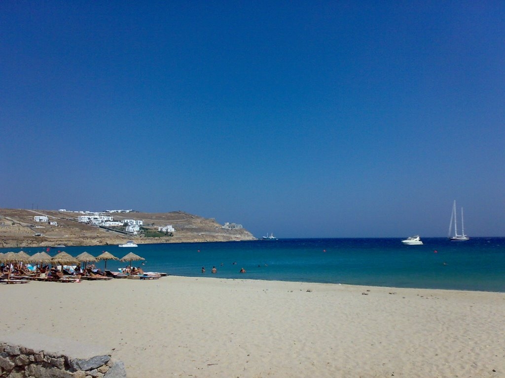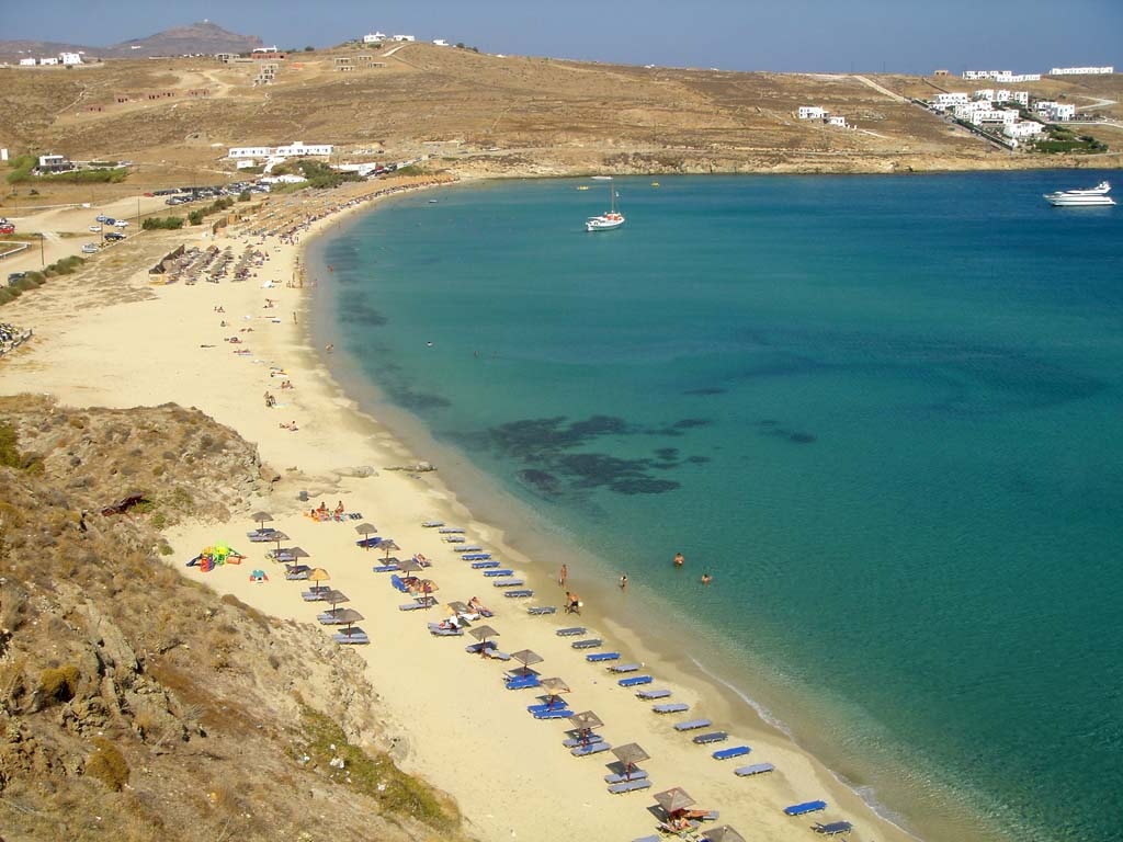 In the south east part of the island (10 kilometers away from the center), between Elia and Kalafati, is located Kalo Livadi, one of the biggest beaches in Mykonos. The new hot-spot of celebrities, the liveliness of young people in beach-bars and space for families also, are right here. You will find shallow water, comfortable sunbeds, straw umbrellas, restaurants, beach-bars, changing rooms and water sports. Famous bar-restaurant is SOLYMAR with lots of people every day, liveliness and loud music.