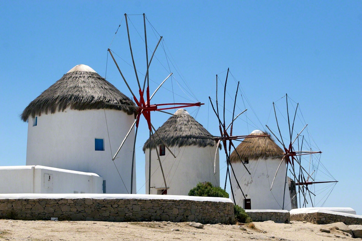 From as early as the 16th century one of the most recognized landmarks of Mykonos have been the windmills. Due to it”s geographic position, Mykonos was situated on major sea trade-route which at one time joined Venice, the gateway of Europe, to Asia. The need to refine grain and compact it for transport combined with an ample year round supply of wind made Mykonos the perfect location. Easy access to the harbor was necessary so most of the island”s mills were positioned in or around the main port with the highest concentration covering the entire western portion of town. With the coming of industrialization the windmills importance began to decline as well as their numbers. The cluster of Kato Myloi (Lower Windmills), which rise proudly over the sea, on the small hill southwest of Hora (the city of Mykonos).